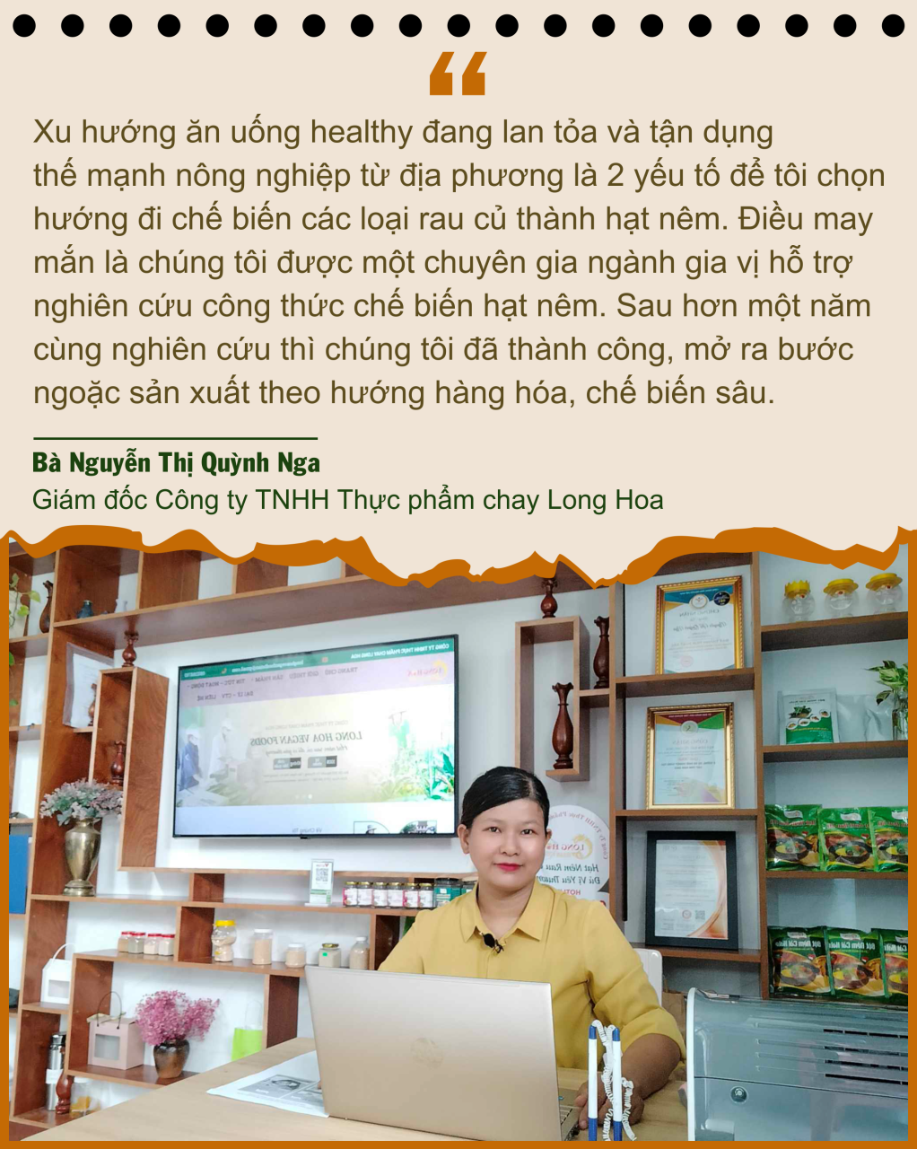 Trăn trở nhiều về câu chuyện nông sản “được mùa mất giá” nên Nguyễn Thị Quỳnh Nga (Công ty TNHH Thực phẩm chay Long Hoa, phường Cẩm Nam, TP.Hội An) ấp ủ một dự án khởi nghiệp vừa có thể tạo ra sản phẩm có giá trị cao vừa giải được bài toán đầu ra cho nông sản Quảng Nam. Vốn có kinh nghiệm trong ngành thực phẩm, chị nhận thấy tiềm năng lớn của ngành sản xuất gia vị vì thế đã mạnh dạn chọn đây làm hướng đi.