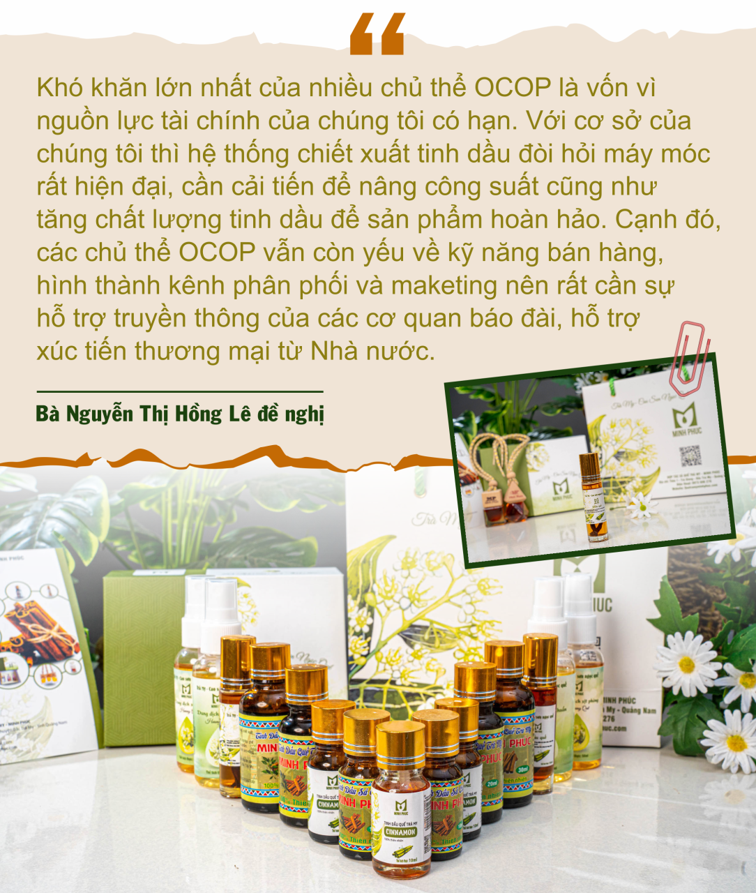 Bà Nguyễn Thị Hồng Lê cho biết sau nhiều thăng trầm, sản phẩm tinh dầu quế của HTX đã được công nhận là OCOP 3 sao và năm 2021 được nâng hạng 4 sao. Tuy nhiên, bà cho rằng quá trình làm nên những sản phẩm OCOP đặc trưng của Quảng Nam theo hướng chuỗi liên kết, có sự tham gia và hưởng lợi của cộng đồng, tận dụng vùng nguyên liệu sẵn có vẫn còn là quãng đường dài cần được chính quyền “hà hơi tiếp sức”.